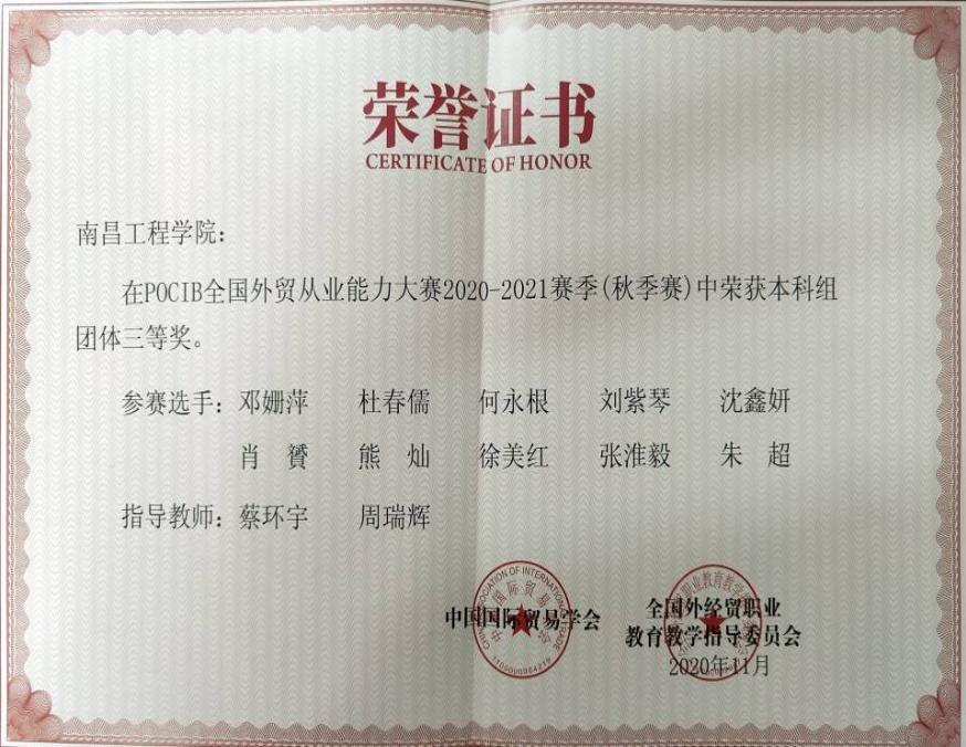 为进一步推动学生职业能力的培养与锻炼,提升学生职业能力的水平,由我院国际经济与贸易专业学生组成的三支参赛队在国贸教研室的全体老师认真指导下,于2020年10月20日-11月3日参加了第十届POCIB全国外贸从业能力大赛。近日,赛事组委会揭晓了比赛成绩,我院三支队伍全部取得优异成绩,荣获团体二等奖2项,团体三等奖1项。据悉,本届大赛共有116所本科院校287支队伍参赛。本项赛事是由中国国际贸易学会、全国外经贸职业教育教学指导委员会主办。(文/图:刘义杰)