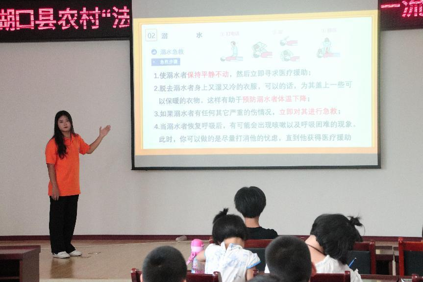 四、溺水警钟需长鸣,救护知识记心中。盛夏是溺水事故高发时间段,实践团成员就“防溺水”进行专题讲解,通过理论与实践相结合,向小朋友们传授防溺水和应急救护知识,并运用所学知识进行了现场实际演练,指导小朋友们进行心肺复苏模拟训练,提高小朋友们自救和他救的能力和技巧。