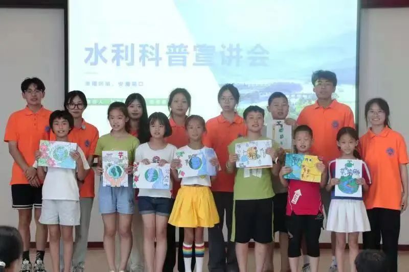 二、水利科普启心智,爱水护水润心田。水是生存之本、文明之源。为加强乡村儿童节约用水、保护水资源的意识,实践团成员运用“讲述+绘画”的方式对当地儿童进行了水利知识科普,向他们介绍水利的基本含义、有关水的相关法律法规,以及日常生活中节约用水的方法,引导小朋友们结合所学知识、所获感悟绘制水资源保护宣传画,启迪心智,做自觉节水、护水的践行者。