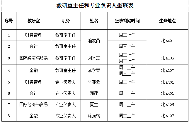 为加强师生共同体建设,深入推进学业导师制,促进教学相长,学院拟推进教研室主任和专业负责人坐班答疑和自习辅导制度,全院各教研室主任和专业负责人对同学们的学业、专业与职业、创新创业、考研与就业等进行全面指导。现公开本学期教研室主任和专业负责人坐班答疑与自习辅导信息,请同学们查询老师坐班答疑与自习辅导的时间和地点,积极与老师沟通交流。