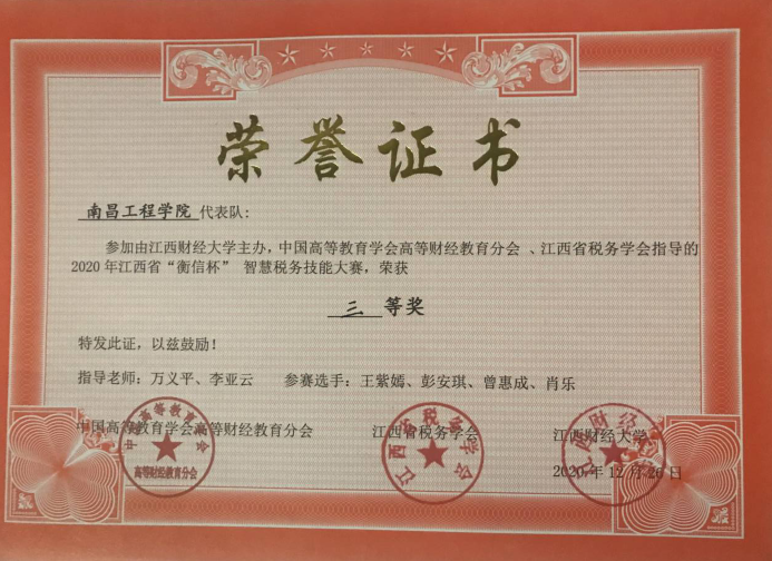 为深入贯彻落实《国务院办公厅关于深化高等学校创新创业教育改革的实施意见》精神,进一步提高高校学生专业素质和职业技能,培养和挖掘经济社会发展所需的创新型和应用型人才,由中国高等教育协会高等财经分会、江西省税务学会指导,江西财经大学主办,浙江衡信教育科技有限公司提供技术支持的首届江西省“衡信杯”智慧税务技能大赛于2020年12月26日在江西财经大学成功举办。