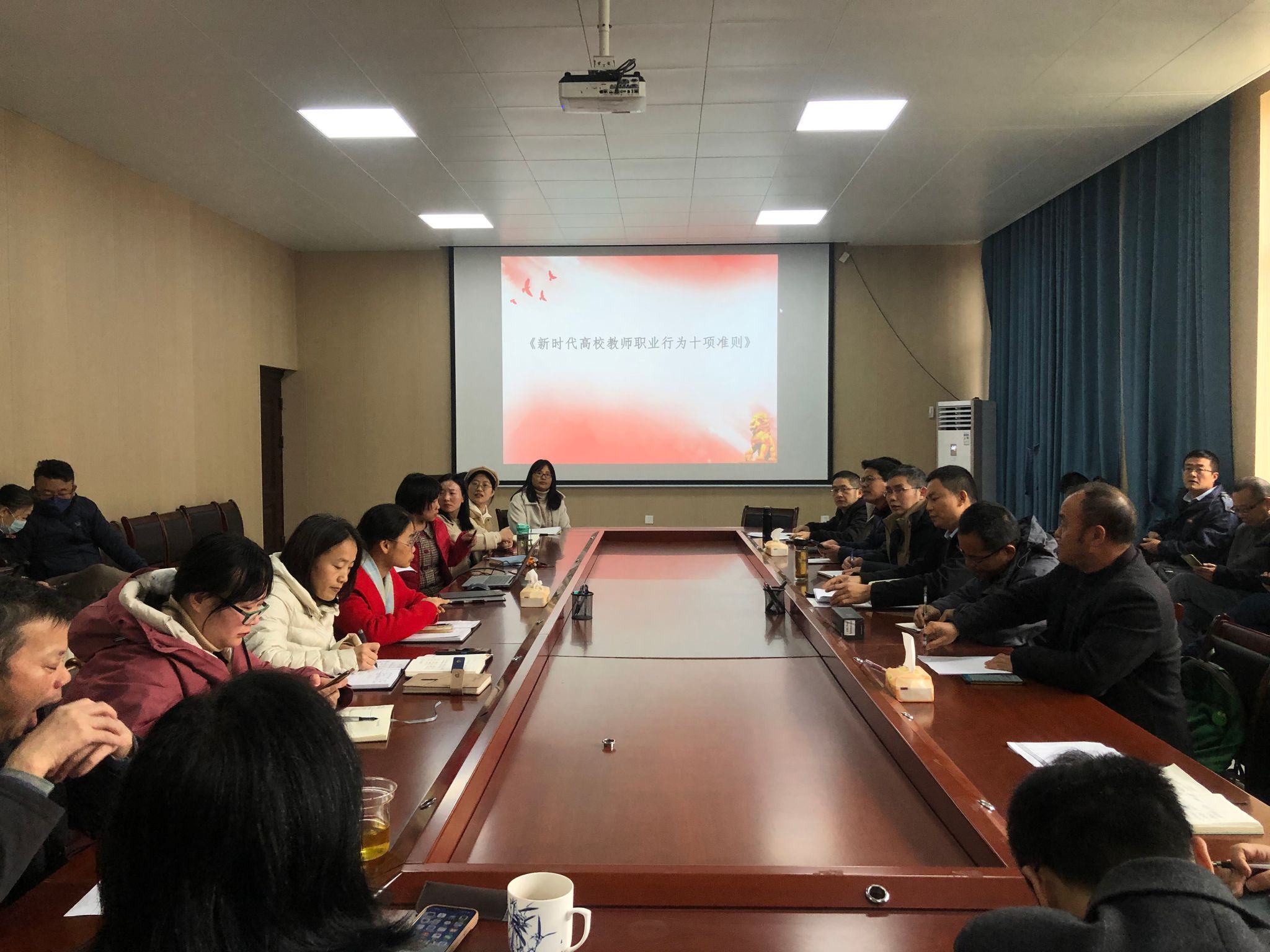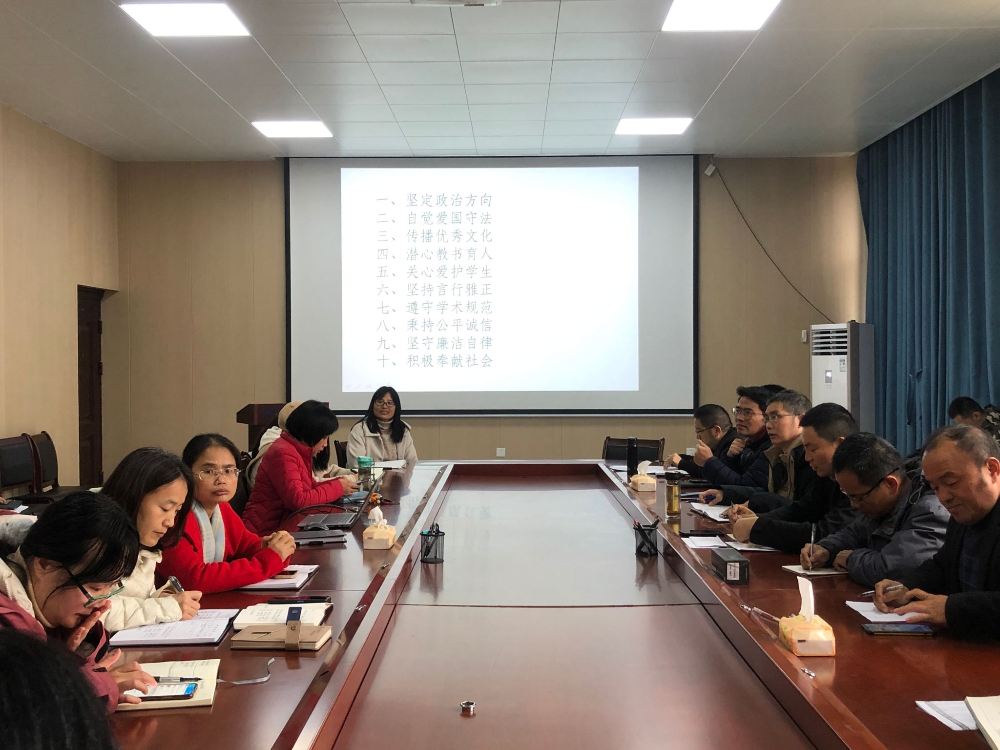 会上,学院党委书记介绍《新时代高校教师职业行为十项准则》文件的出台,具有规范教师职业行为,加强师德师风建设,严格教师自我约束的重大意义。结合高校教师失范行为典型案例,对文件的各项内容进行详细阐述和诠释,再次强调了师德师风建设的必要性和重要性。同时,教师们从个人从教经历出发,围绕十项准则的深刻内涵展开讨论,并表示“身正为范”,严格遵守职业行为准则,强化育人身份意识,做有理想信念、有道德情操、有扎实学识、有仁爱之心的“四有”好老师(文/图 谢淑玉)