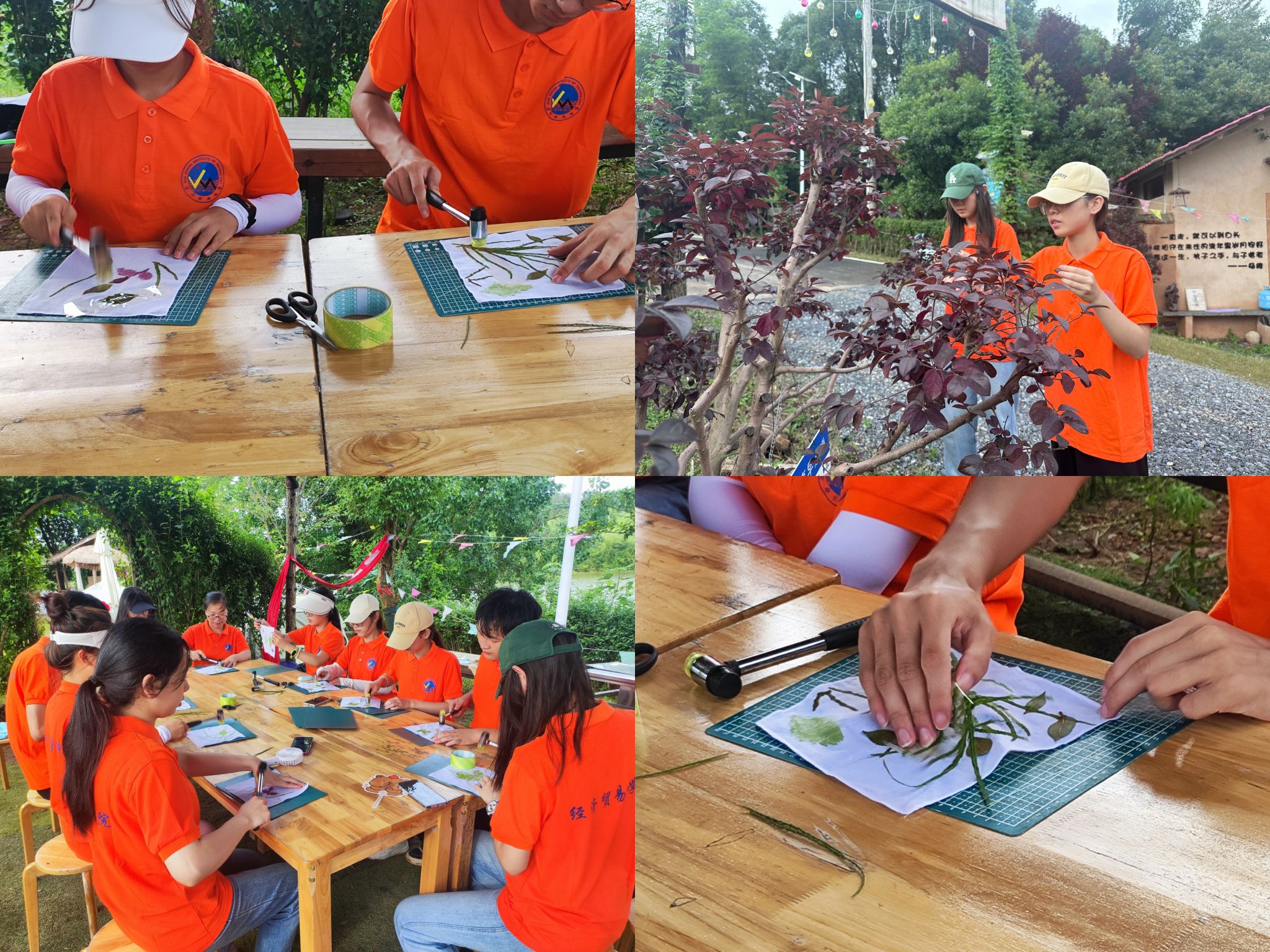 体验植物拓印,传承非遗技艺。潘家湾研学基地负责人为实践团成员详细讲解了植物拓印制作流程与注意事项后,实践团成员迫不及待体验了植物拓印的制作。队员们将各式各样的树叶作为原材料,用透明胶带固定树叶,用特制的钉锤敲打树叶,制作出一幅幅带有植物记忆的美丽画作。