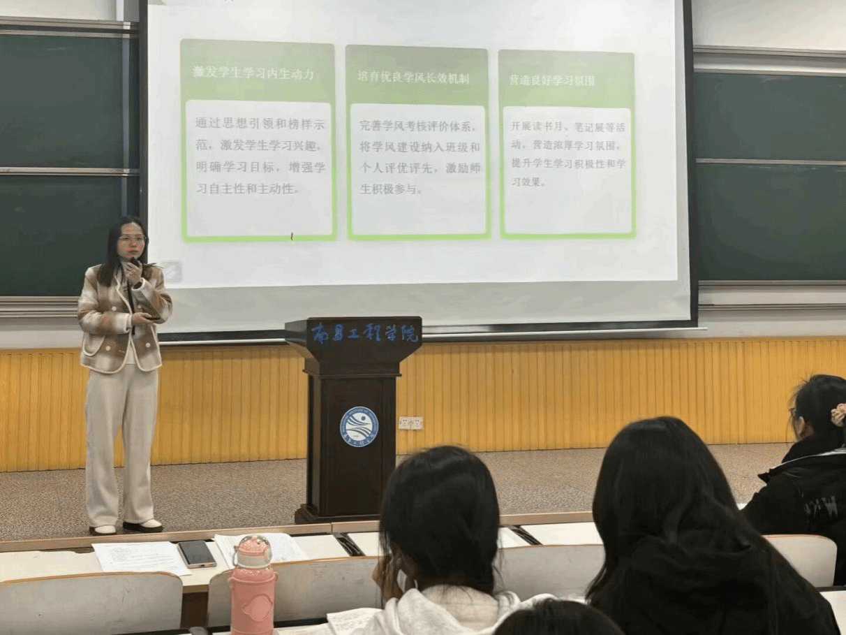 最后,学院学工办主任臧老师强调了学风建设的重要性,希望同学们能够树立清晰的学习目标,并认真制定学业规划;要求同学们严格遵守学院制定的学风建设相关规定,从课堂纪律、学习态度到日常行为规范,做到言行一致;最后鼓励大家积极参与到学风建设活动中,以实际行动共同营造严谨、勤学、上进的学习氛围。